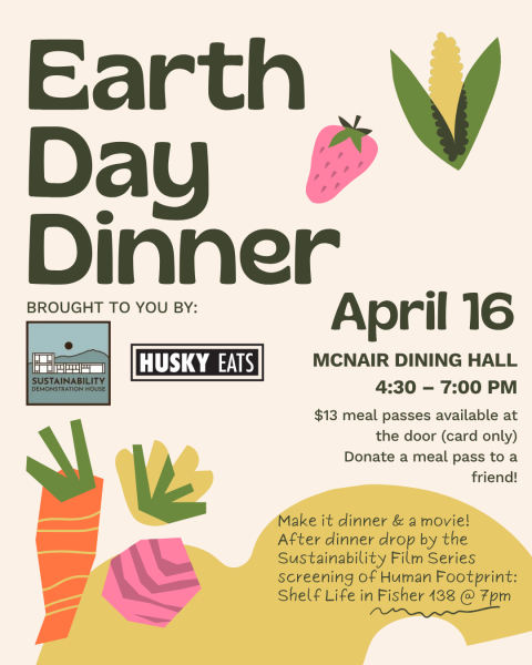 All waste will be composted and diverted from the landfill, and Husky Eats has put together a climate-friendly, low-carbon emissions menu, and we encourage everyone to try some new foods! Join us in the McNair dining hall on Thursday, April 16th, from 4:30-7:00 pm.