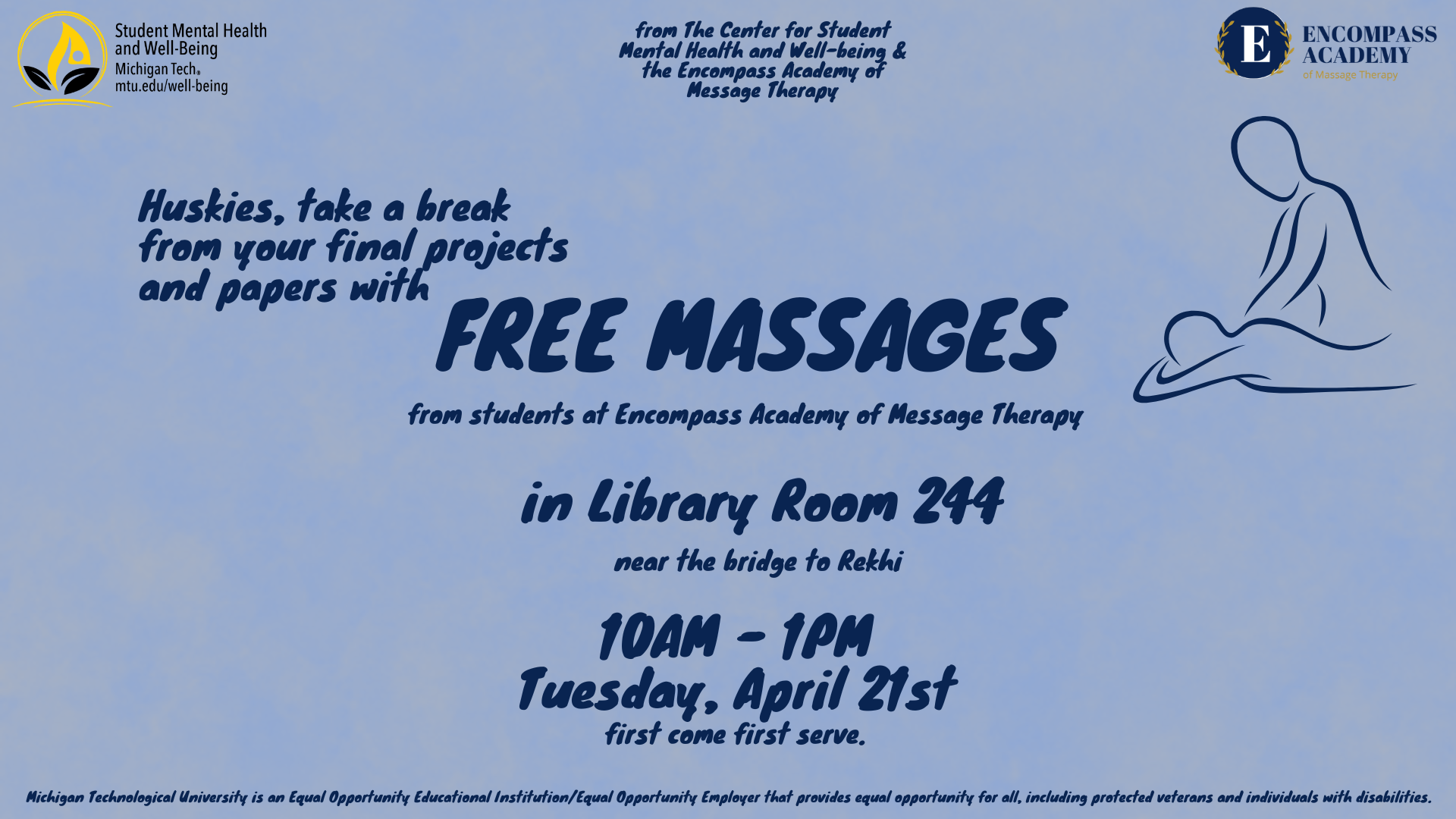 Take a break, Huskies. You’ve earned it. Stop by during finals week for free chair massages and give yourself a moment to relax, reset, and recharge. Whether you’re feeling the pressure of exams or just need a quick pause, we’ve got you covered. Drop in, unwind, and come back feeling refreshed.