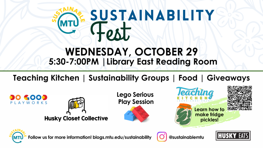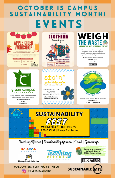 Join us in celebrating Campus Sustainability Month this October! Groups on campus will be hosting events all month followed by the annual Sustainability Fest on October 29th with fun activities from different organizations on campus including Husky Eats and the Husky Closet Collective! Check out the Sustainable MTU Instagram for more information, and join the Sustainability Events Calendar to stay up to date on events. We hope to see you there!