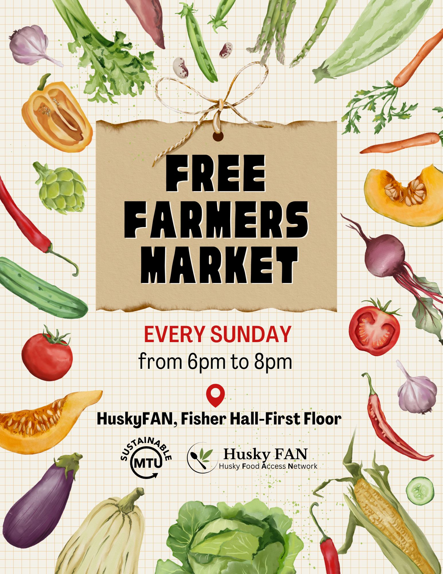 The Free Farmers Markets provide fresh produce from the wads garden to the HuskyFAN food pantry every Sunday from 6-8pm (until the weather no longer allows for produce). Stop by to get some delicious fresh food!