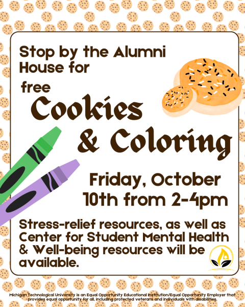 Take a break and unwind at Cookies and Coloring! Stop by the Alumni House on Friday, October 10th between 2-4pm for some free cookies and coloring! Enjoy tasty treats while you relax—it’s a perfect way to de-stress and recharge.