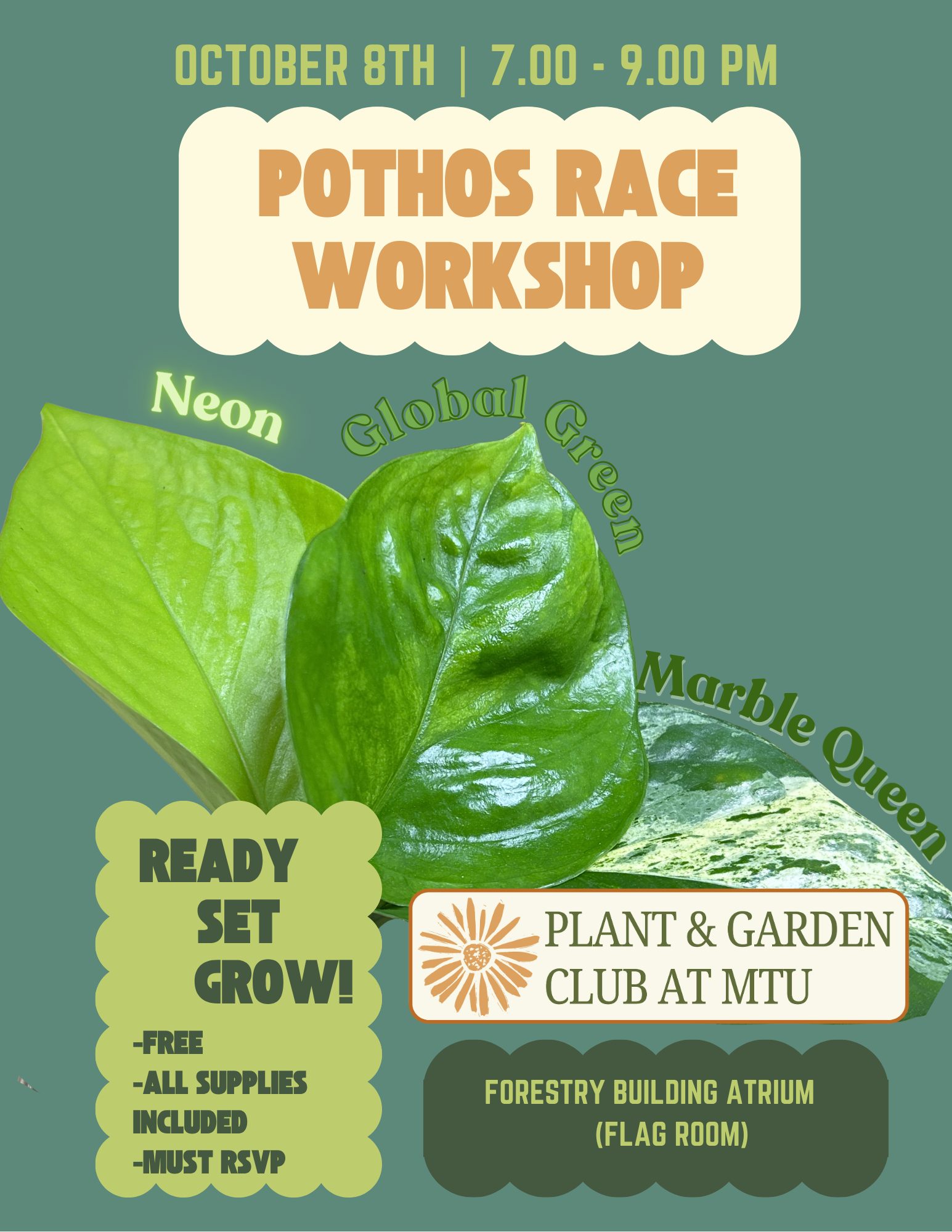Pothos Race Workshop tonight! RSVP here to reserve a spot. Show up to the forestry building anytime between 7-9PM with an RSVP, grab a cutting, and pot it up. At the end of the year we’ll vote on the the best pothos, and we’ll have a prize for the winner.