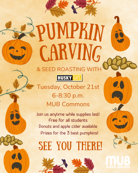 Join us on Tuesday, October 21st in the MUB commons to celebrate fall with pumpkin carving! Enjoy warm apple cider, donuts, and roast your own pumpkin seeds with Husky Eats. Drop in anytime during the event — supplies are limited, so don’t wait too long! There will be prizes for the top pumpkin carved designs as well!