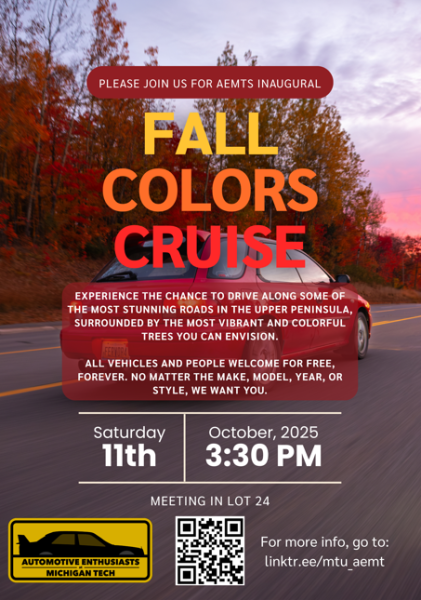 Every year, our beloved Keweenaw Peninsula provides some of Michigan’s best fall colors. This year, for the first time ever, join the Automotive Enthusiasts at Michigan Tech for our Fall Colors Cruise! AEMT wants to invite all students to come on a slow-paced scenic drive through some of the best local locations for seeing the leaves change. Any kind of car is welcome, and the event is free for all drivers and passengers to attend. Gas will not be reimbursed. The cruise will leave from Lot 24 at 4:30 PM and will likely last a couple hours. Bring your friends or your favorite passenger prince/princess!