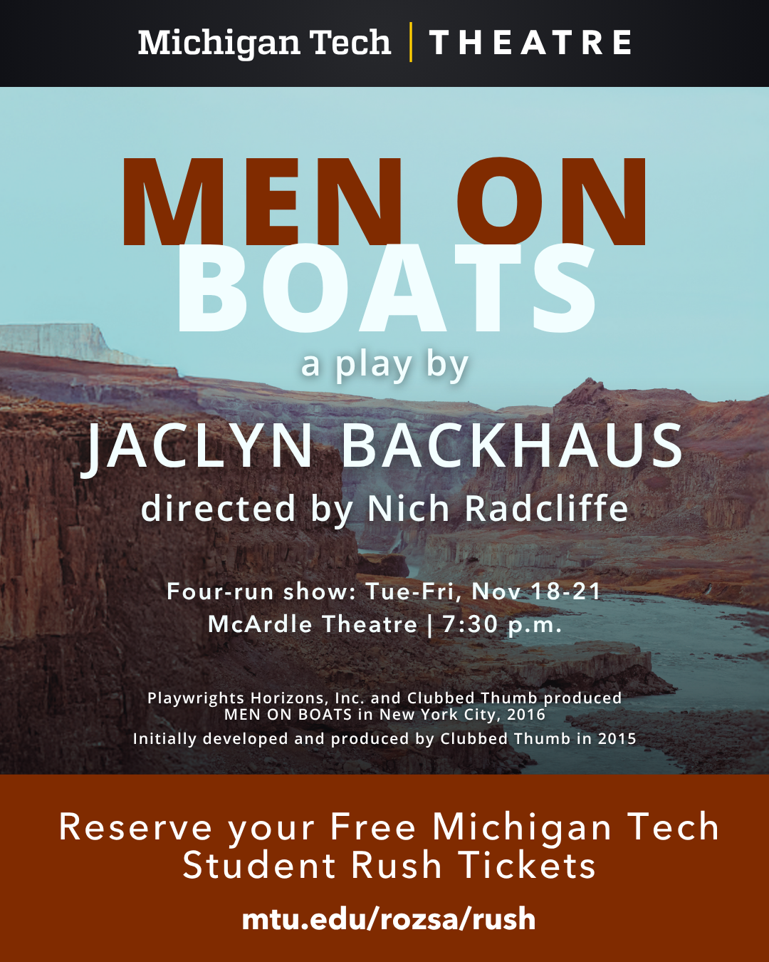 THIS WEEK: Men on Boats LIVE on the McArdle Stage. Reserve your Free Student Rush Tickets