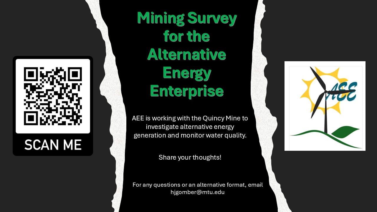 MTU students, staff, and members of the Houghton/Hancock community are invited to be a part of the Mining Survey created by the Quincy Mine team in AEE. The Quincy Mine team is working with Tom Wright, the Facilities Manager at the Quincy Mine Hoist Association, to understand perceptions of local non-operational mining sites, associated environmental concerns, and the possible utilization of existing mining sites for energy generation. The survey is anonymous and will only take 5-10 minutes to complete. The survey can be found here!