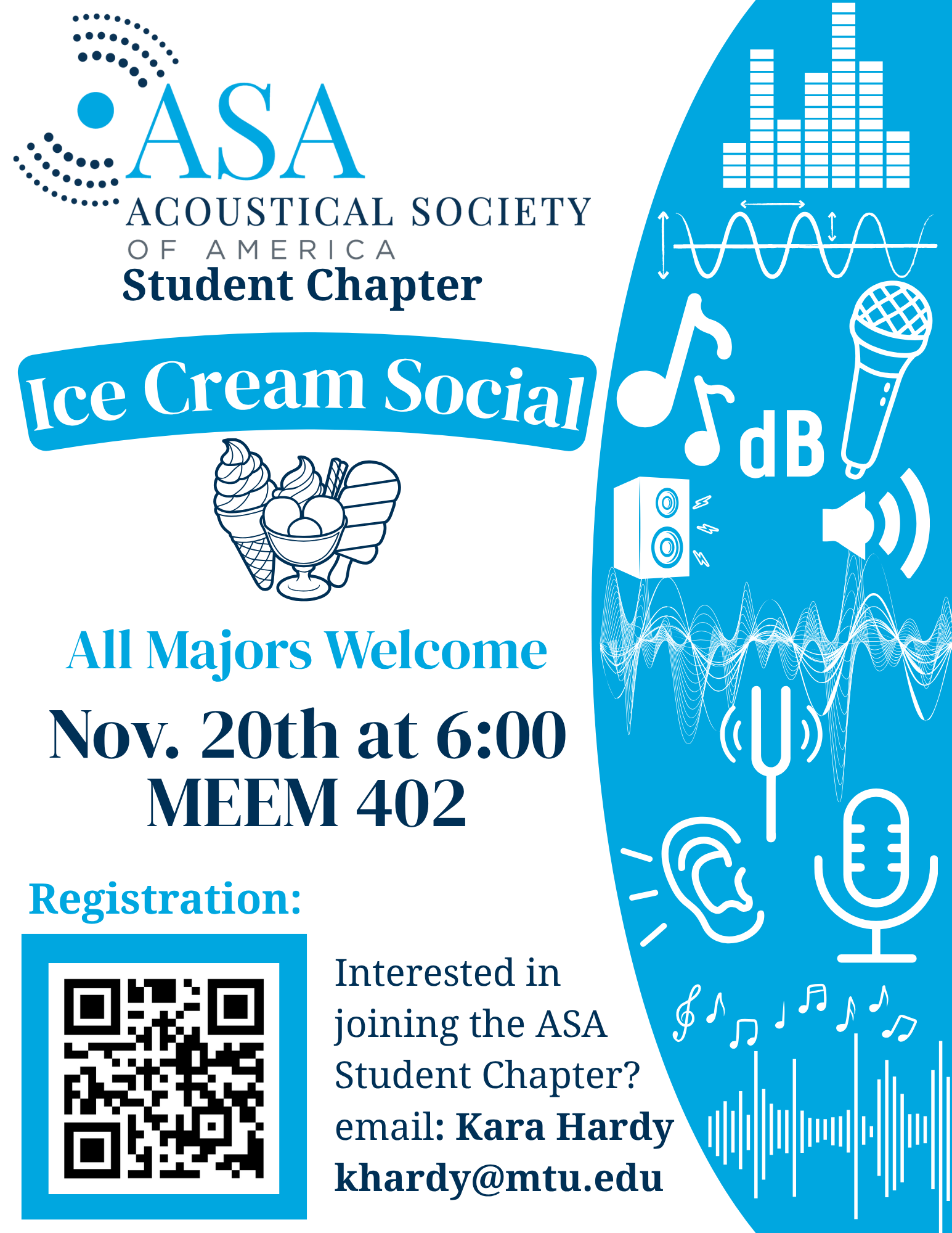 Meet us in MEEM 402 for the Acoustical Society of America Student Chapter’s first social event at 6 pm on November 20th. There will be ice cream! If you are interested in attending or learning more about the ASA Student Chapter please fill out this form .