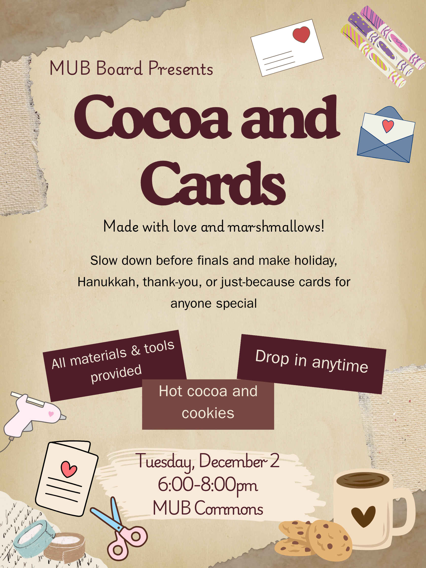 Need a breather before finals? Come sip hot cocoa and make cards with us! Create something special for the holidays, Christmas, Hanukkah, or just to say thank you to someone who made your semester great. Bring a friend, enjoy the cozy vibes, and take a break on Tuesday, December 2 from 6–8 PM in the MUB Commons.