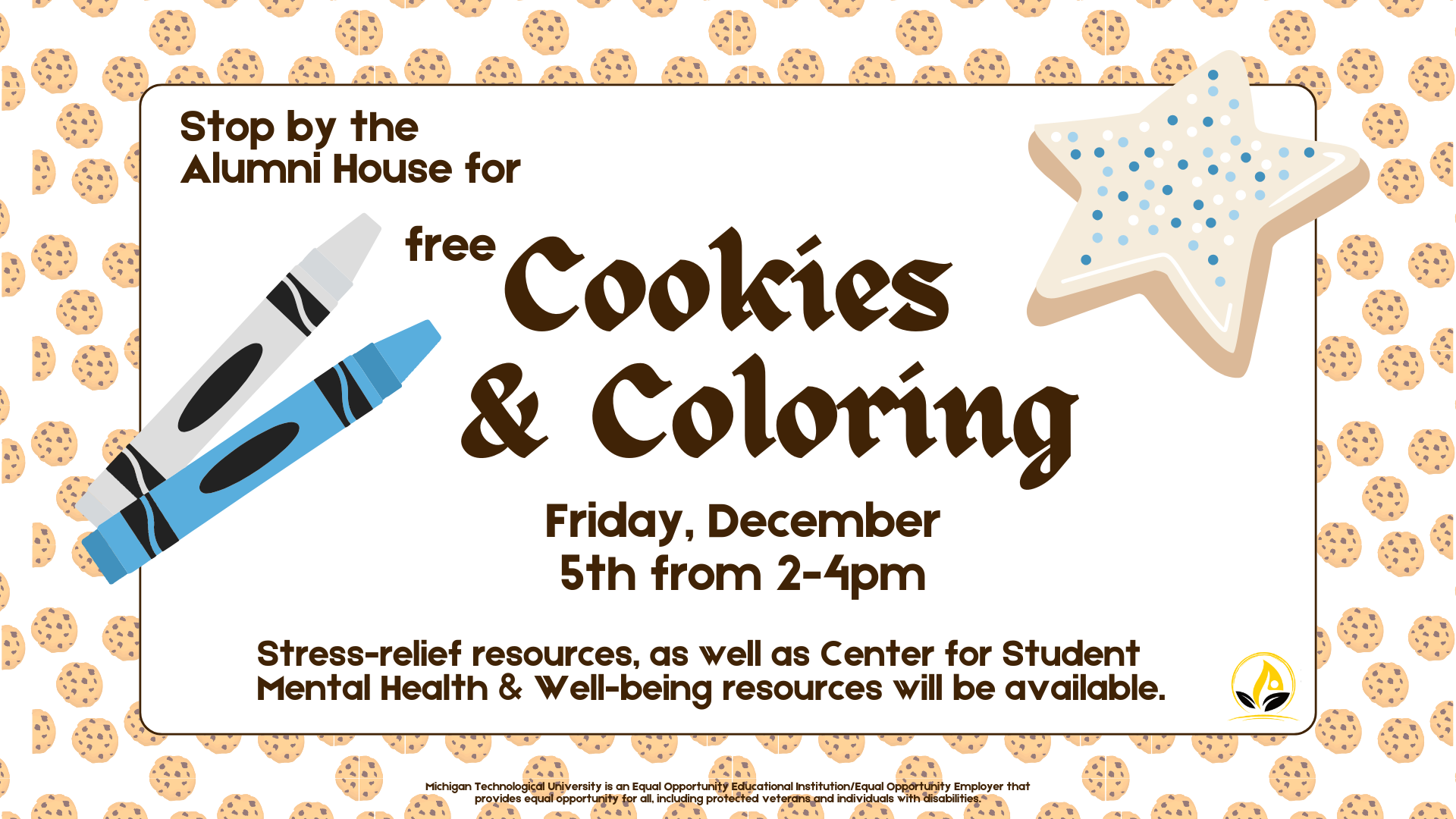Close out your semester by spending some time at Cookies and Coloring! Stop by the Alumni House basement on Friday, December 5th between 2-4pm for some free cookies and coloring! Enjoy tasty treats while you relax with some coloring—it’s a perfect way to de-stress and recharge.