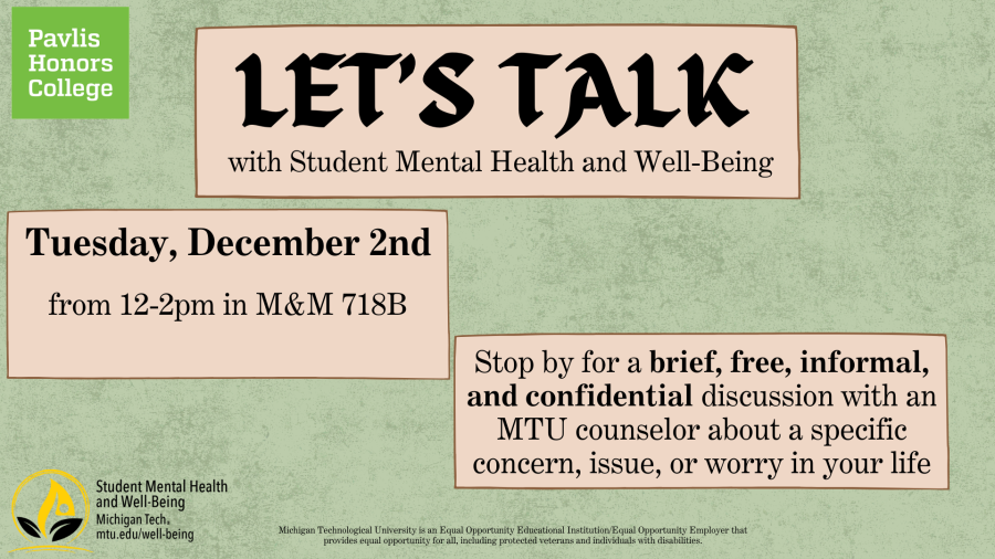 Not sure if counseling is right for you? Try Let’s Talk on Tuesday, December 2nd from 12-2pm in the Minerals & Materials Building, room 718B! This free, informal, and confidential service is a chance to chat with a Michigan Tech counselor about mental health questions or concerns. Available to all undergraduate and graduate MTU students—stop by and start the conversation!