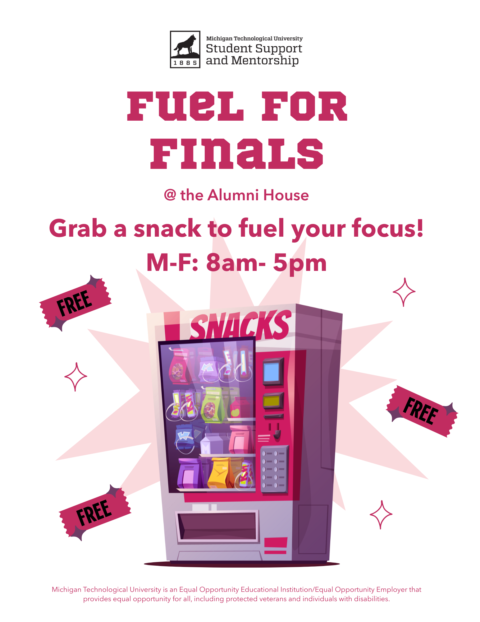 Stop by Student Support and Mentorship at the Alumni House December 1–5, between 8am and 5pm, to grab a snack to fuel your focus as you study for finals!