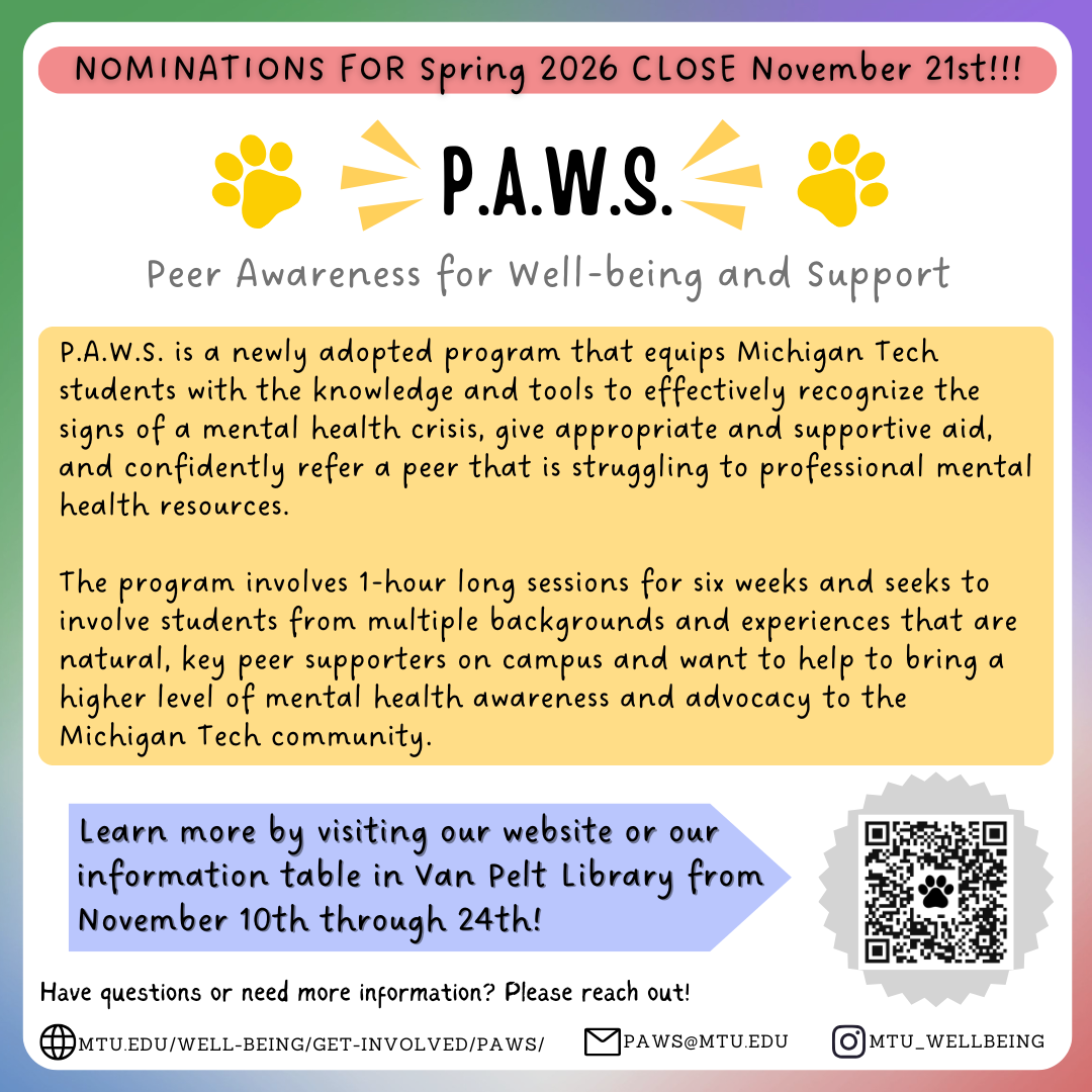 Passionate about mental health? Looking for a way to make a difference on campus? P.A.W.S. (Peer Awareness for Well-Being and Support) is accepting nominations for the Spring 2026 cohort! This program equips students with valuable training in active listening, empathy, and stress management while fostering a supportive community dedicated to mental health awareness. If you want to enhance your skills, connect with like-minded peers, and help create a culture of well-being at Michigan Tech, P.A.W.S. is the perfect opportunity.