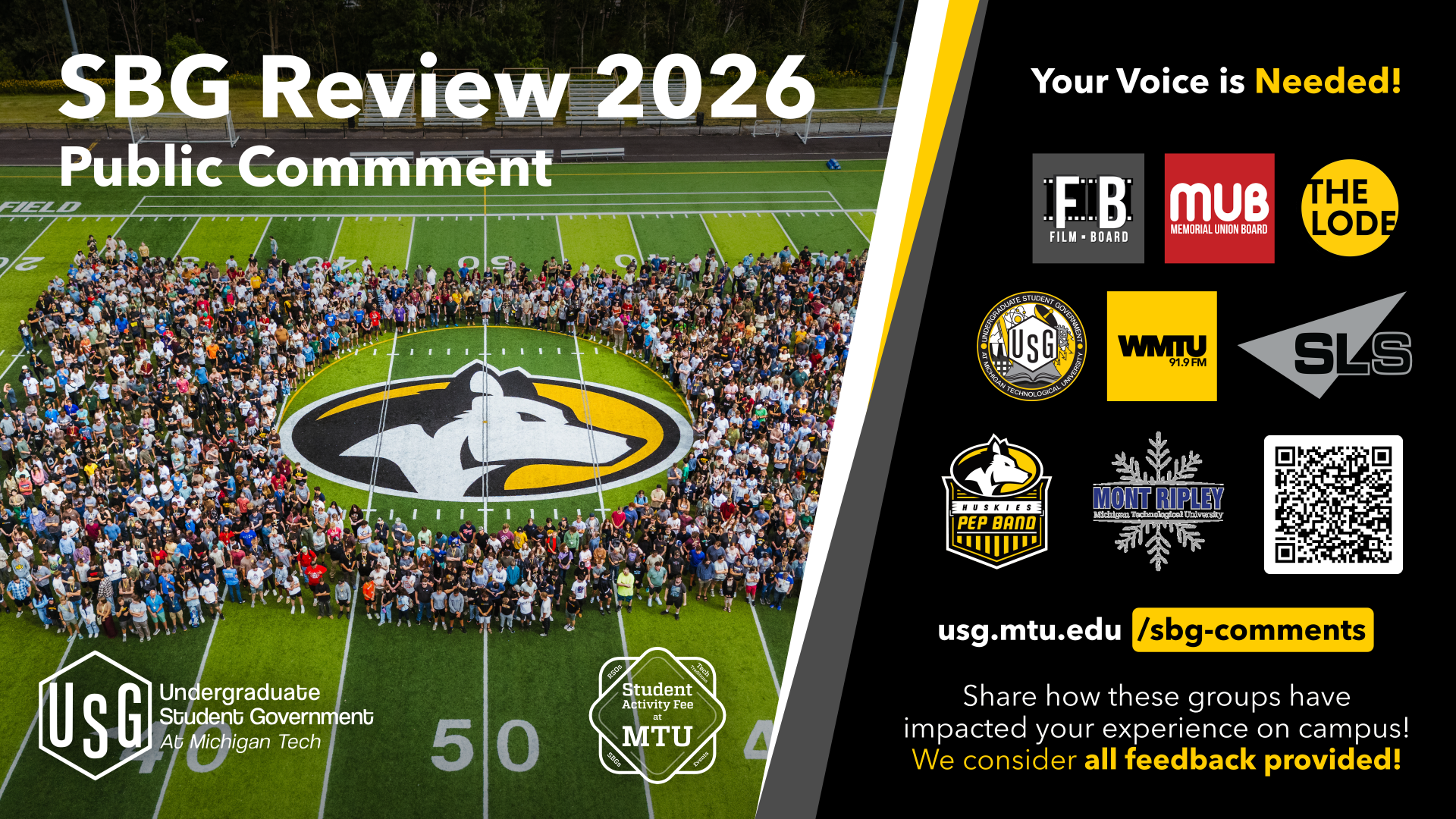 Please visit usg.mtu.edu/sbg-comments to submit your feedback, or reach out to the Undergraduate Student Government Treasurer at usg-treasurer@mtu.edu for more information. Thanks for sharing your thoughts!