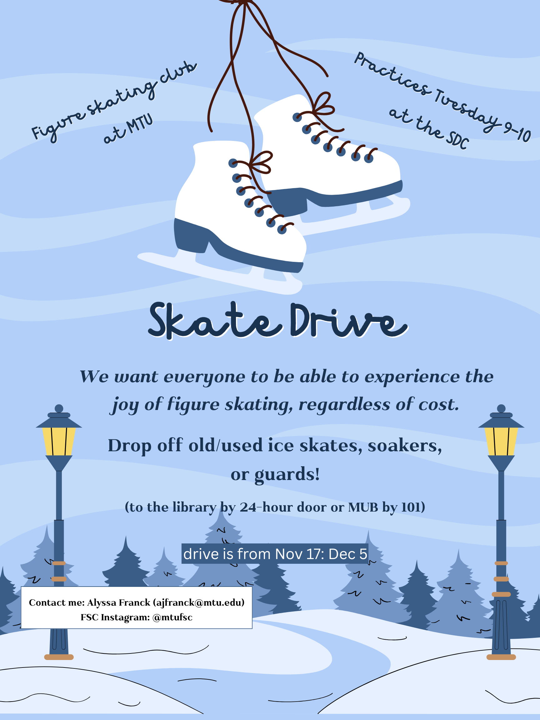 Do you have any old ice skates, soakers, or guards sitting around? Drop them off at the Figure Skating Club’s skate drive! The drive will run from November 17 to December 5, with bins in the Memorial Union Building by MUB 101 and in the library by the 24-hour door. Previously, we’ve had a bring-your-own-skates policy in our club, which can be financially draining. By donating skates, you provide the opportunity for participants to experience figure skating regardless of financial obstacles.