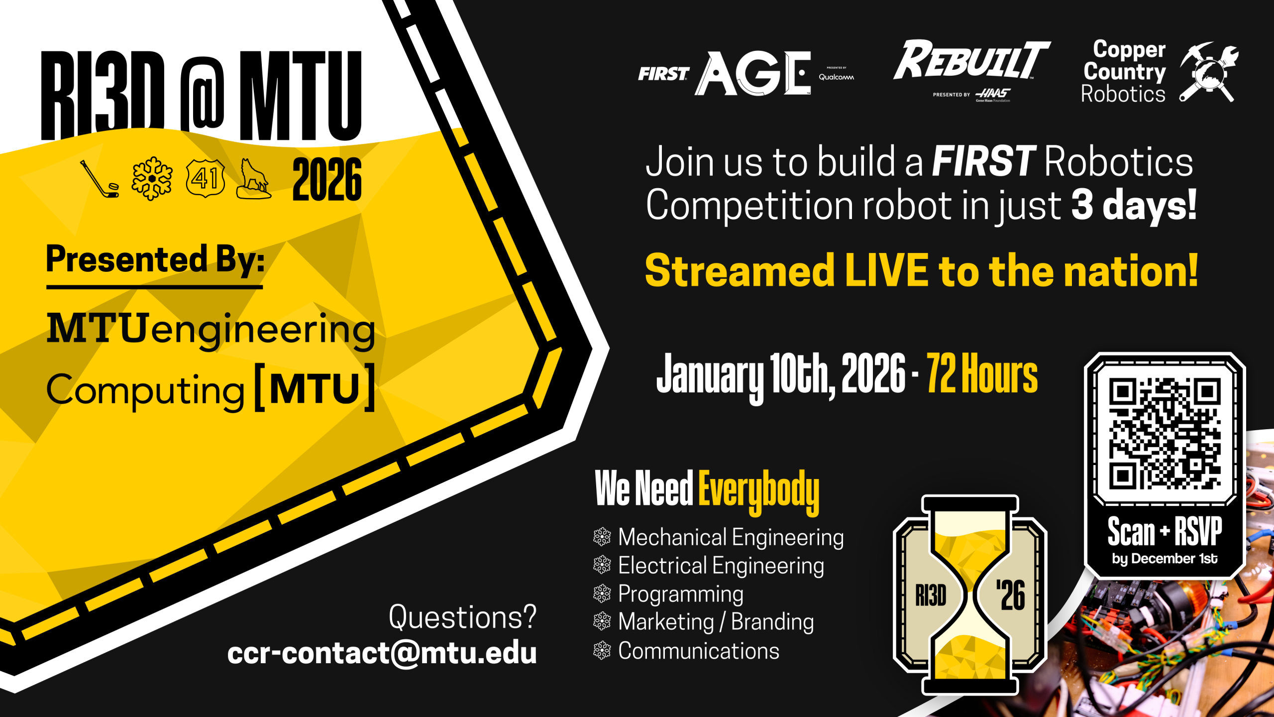 Copper Country Robotics at Michigan Tech is hosting the second year of Robot in 3 Days at Michigan Tech, where the most dedicated FIRST Robotics students will ideate, design, build, program, and market a robot from scratch in just 72 hours! Starting on January 10th, 2025 at 12:00PM, we will work as a group to pioneer these engineering challenges. This year’s FIRST Robotics Competition game: REBUILT, presents great challenges to high school teams across the world, and colleges throughout the midwest and beyond are ramping up to show our skills and expertise as a core pillar of robot ideation and design. We’re looking for students to join our crew and help us become an example across the entire Upper Peninsula for what a sound and beautiful robot looks like.
