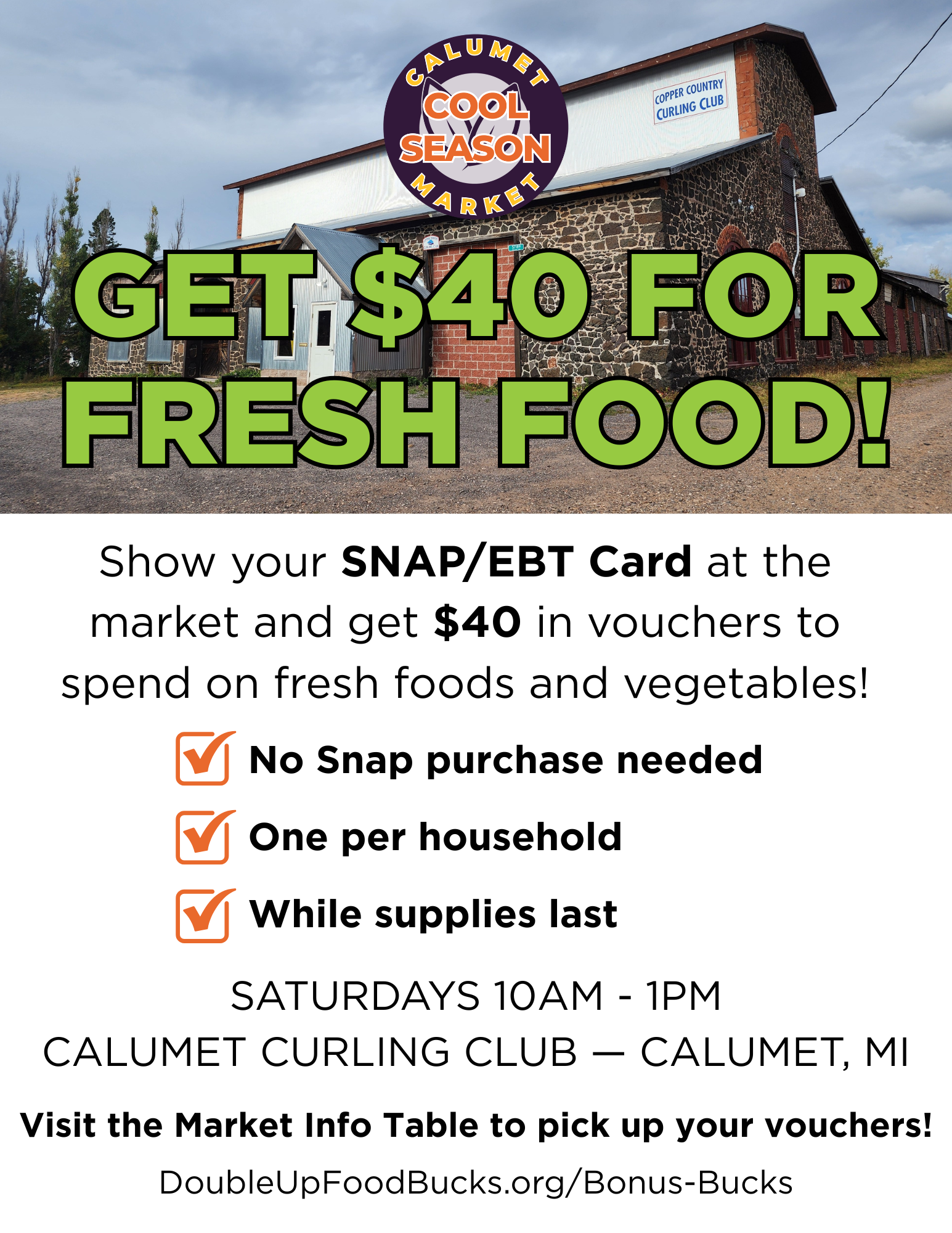 Receive $40 to spend on food at the Calumet Cool Season Farmers Market! All you have to do is show your SNAP/EBT card at the market info table! There is a variety of local produce available.