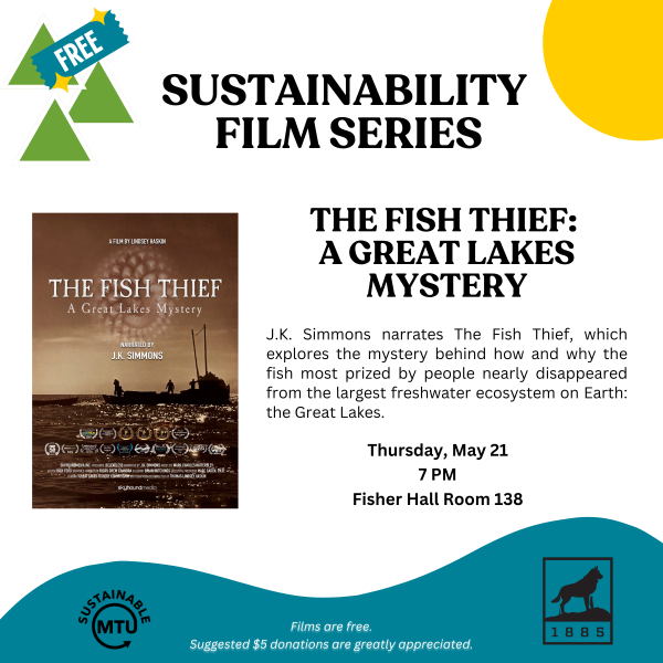 ‘The Fish Thief: A Great Lakes Mystery’ will be shown at 7 p.m. on Thursday, May 21 in Fisher Hall 138. Refreshments will be provided, and each film will be followed by a facilitated discussion. The Sustainability Film Series is free and everyone is welcome to attend. A suggested $5 donation is appreciated and helps to support the continued offering of this film series.