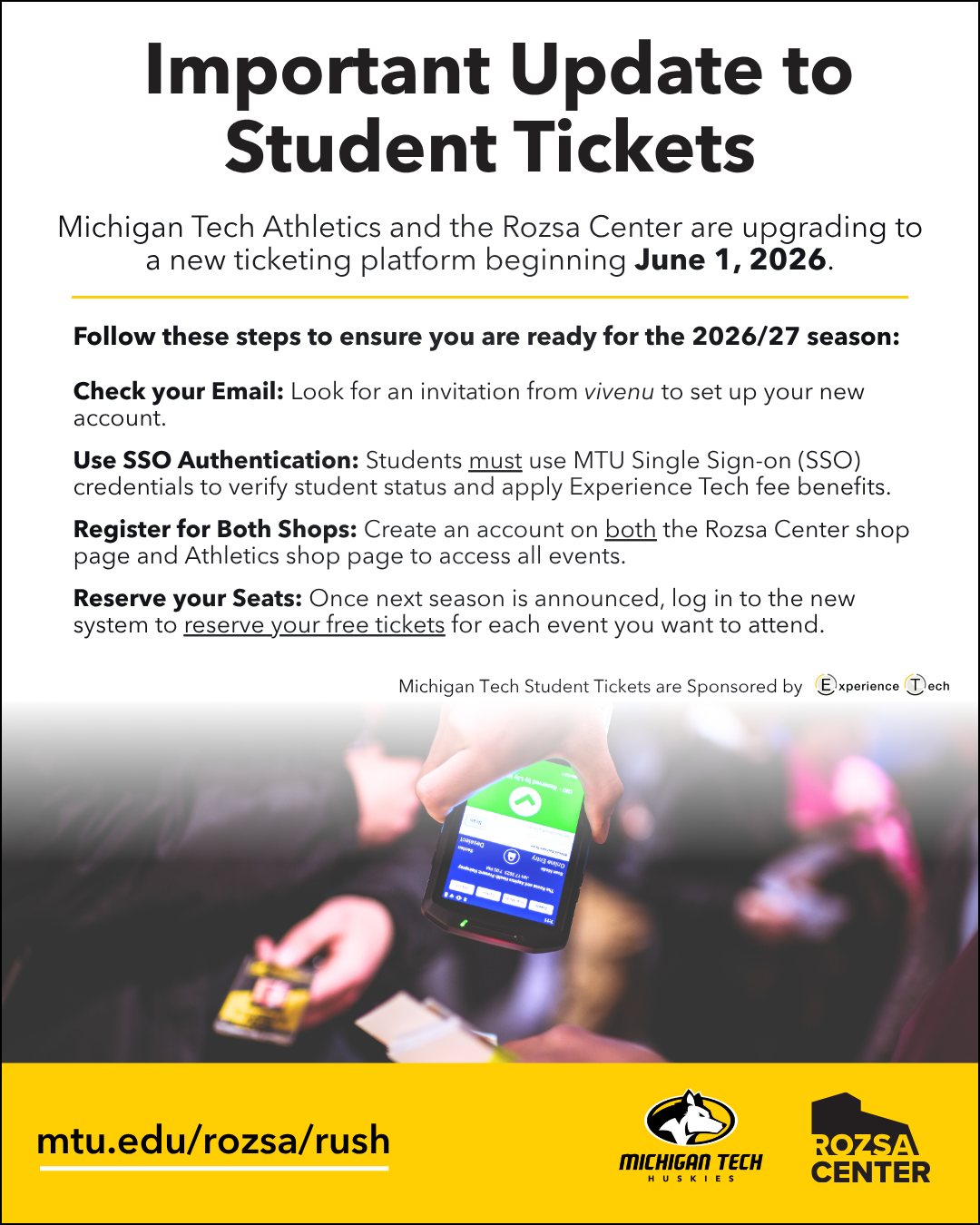 Michigan Tech Athletics and the Rozsa Center are upgrading to a new ticketing platform, vivenu, beginning June 1, 2026. This transition will replace the current UniversityTickets system to provide a more streamlined experience for students claiming their free tickets provided through the Experience Tech fee.
