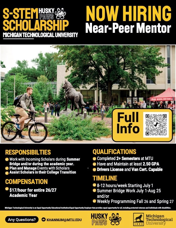 Do you want to help the next generation of Huskies thrive at MTU? Do you have strong organizational skills, leadership potential, and a desire to mentor other students? The Husky PAWS S-STEM program is hiring Near-Peer Mentors for 2026–27.
