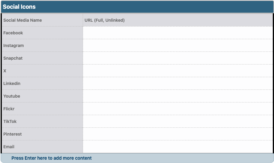 For each icon that you want to appear, enter your full URL for that platform in the Link field next to the corresponding name of the platform. The order of the list in the snippet is the order the icons will appear.