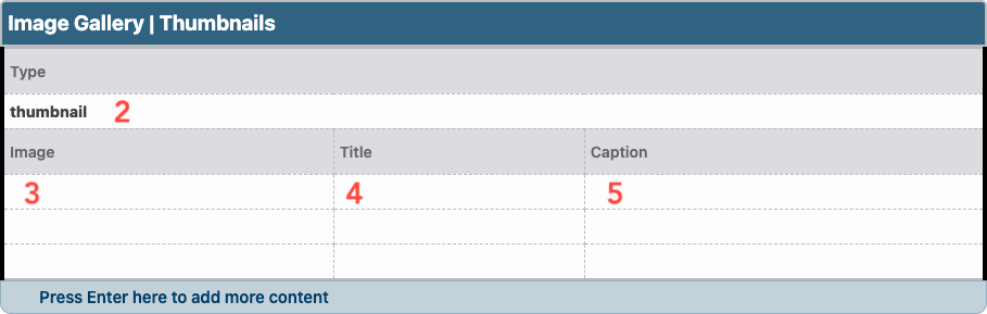 - Select thumbnail or gallery from the dropdown menu to select the gallery display type. View the thumbnail option or the gallery option in the Style Guide.