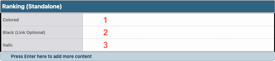 - Enter the number associated with the ranking in the Colored field. Use No. instead of #.