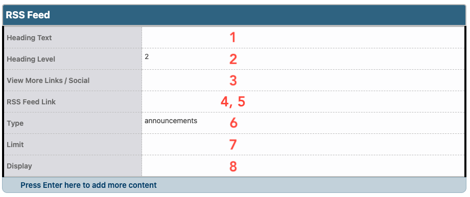 - The URL for the feed is entered in the RSS Feed Link. Follow these instructions to get a news or announcements feed URL.